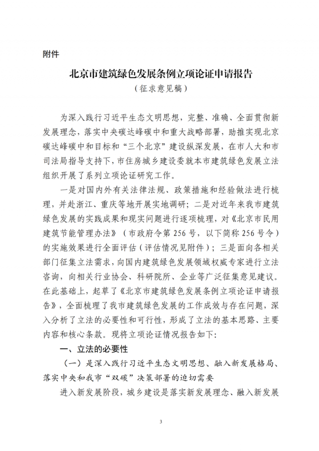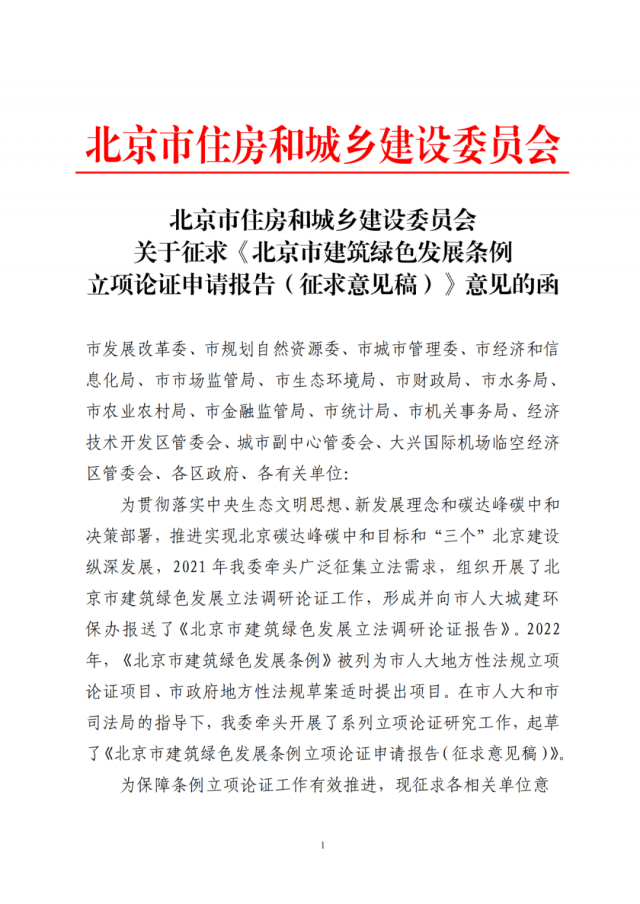 7月4日,北京住房和城乡建设委员会向北京市各相关部门印发关于征求《北京市建筑绿色开展条例立项论证申请报告(征求意见稿)》意见的函,就北京市2021年组织召开的北京市建筑绿色开展立法调研论证工作形创建项论证申请报告。