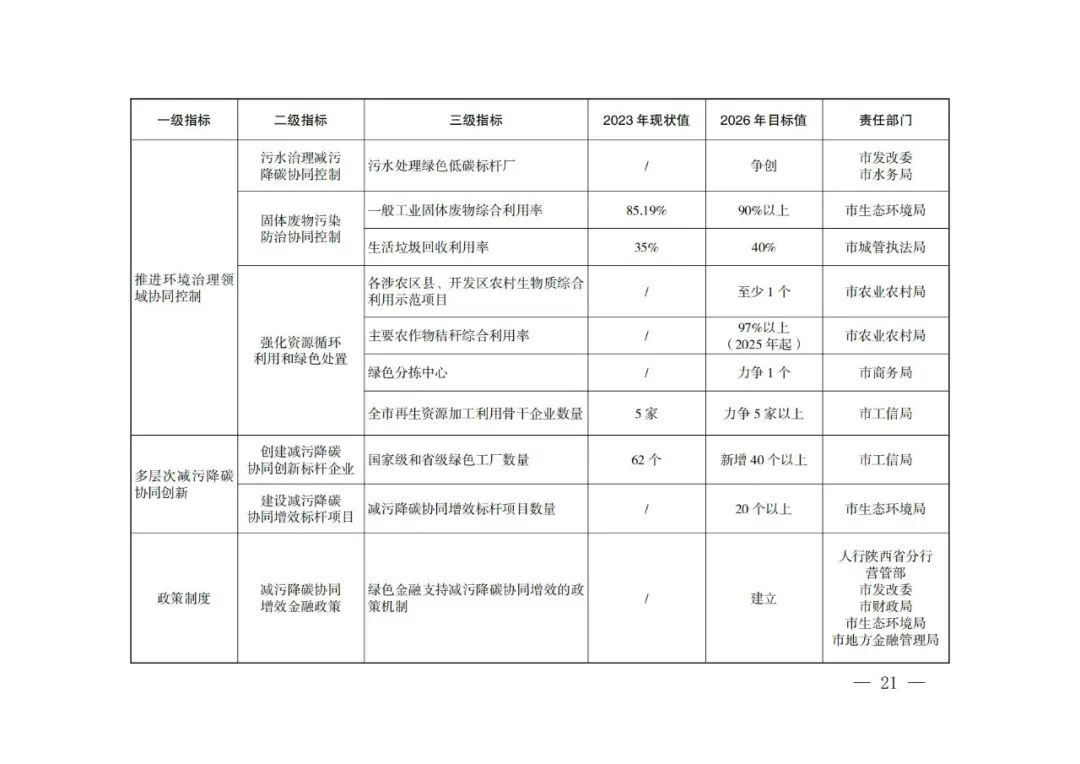 2026年,形成一套减污降碳协同创新管理机制、模式路径和政策举措,构建“4+3+3+6”减污降碳协同创新“西安模式”,即召开能源、交通、工业、环境治理4个领域的减污降碳协同创新,在园区、企业、项目3个层次培育和遴选减污降碳协同创新标杆,出台减污降碳协同增效金融政策、碳评纳入环评新机制、碳排放信息纳入排污许可管理新机制3项减污降碳协同创新政策,提升市级层面试点工作机制创新、减污降碳协同创新评价指标体系创建、大气污染物与温室气体融合清单编制、污染物与温室气体监测核算、固定污染源排放量全口径核算、协同管理创新6种减污降碳协同管理和创新能力。投资约262亿元,推进66个减污降碳协同创新重点项目建设,确保全市非化石能源占能源消费比重达到22%以上,单位GDP能耗、主要污染物总量减排和单位GDP二氧化碳排放降低率完成省上下达目标。碳排放强度下降与生态环境质量改善协同推进取得明显成效,减污降碳协同度达到同类型城市领先水平,绿色低碳循环开展的经济体系初步形成。