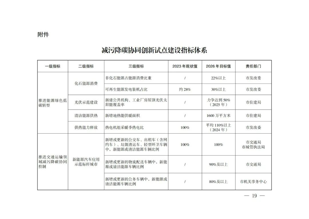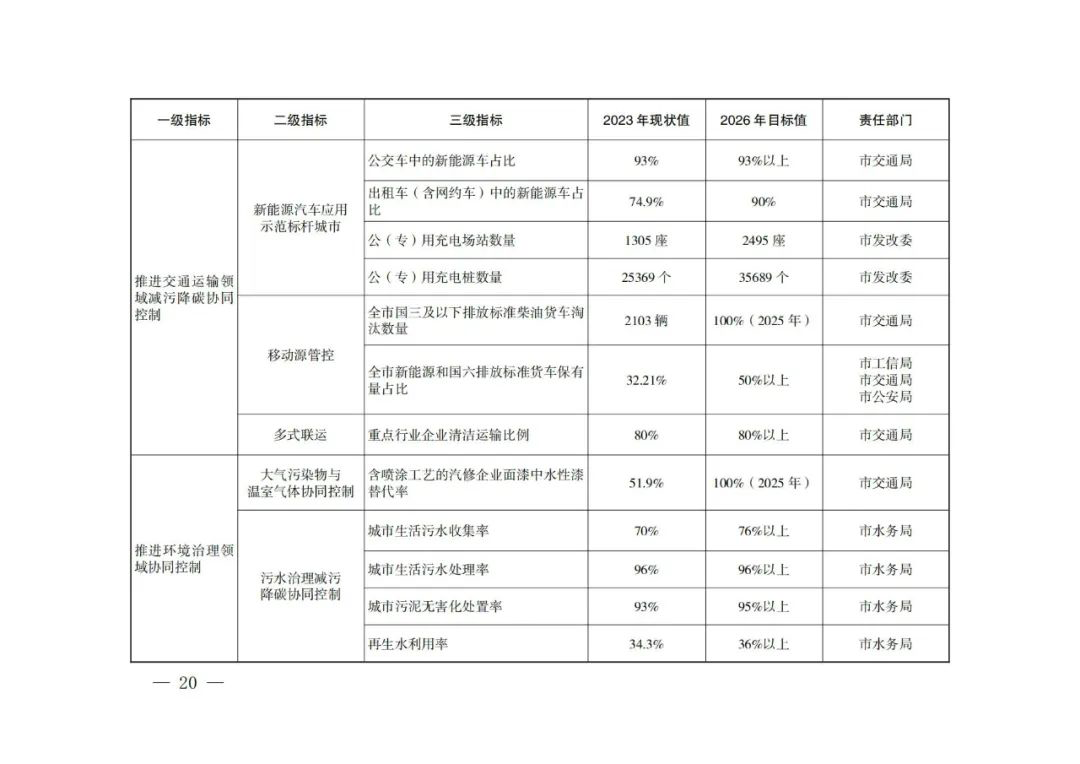 (三)建设减污降碳协同增效标杆项目。围绕能源、交通、工业、环境治理等减污降碳重点领域,创建一批绩效水平高、行业带动性强的减污降碳协同增效标杆项目。在能源领域,围绕分布式光伏发电项目、光伏建筑一体化、新型储能、氢能制造和应用等方面,培育新能源产品、技术和应用标杆项目。在交通领域,结合绿色交通和新能源汽车推广,打造减污降碳、高效节能等技术创新应用标杆项目。在工业领域,聚焦汽车制造、新材料新能源等支柱产业,培育绿色节能技术改造、研发、集成示范的标杆项目。在环境治理领域,打造VOCs协同减排、污水治理、固体废物协同处置、资源循环利用和绿色处置标杆项目。到2026年,全市创建20个以上减污降碳协同增效标杆项目。
