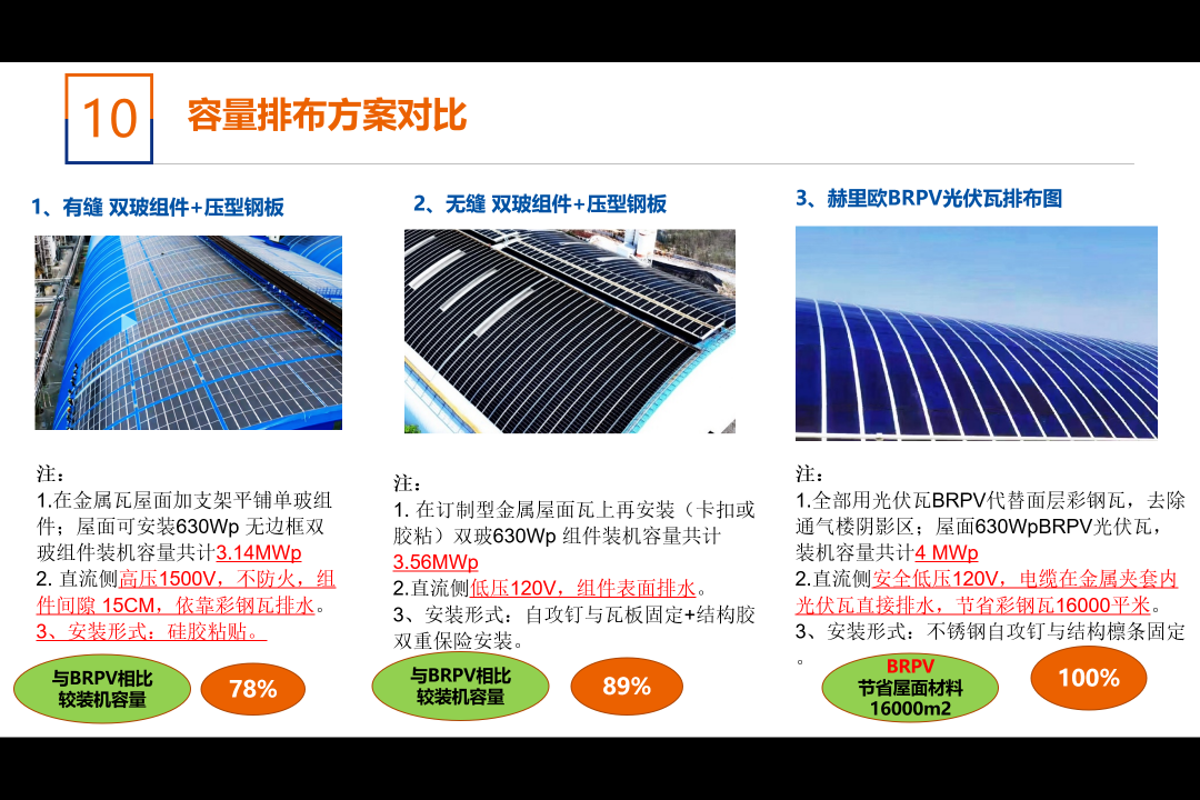 方案2、采用彩钢瓦+无边框双玻组件,彩钢瓦重量7kg/m2,双玻组件重量·· 15kg/m2,二者合计22kg/m2。网架结构屋顶,檩条上方直接安装0.6mm厚度彩钢瓦,双玻无边框组件630W,组件间无缝隙,且用铝型材和自攻钉与屋面彩钢瓦连接固定,组件与瓦楞采用结构胶加固。屋面满铺,以组件作为排水屋面,彩钢瓦仅仅作为支撑用。逆变器采用4KW微型逆变器。屋面组件面电压120V。组件直流线缆安装在组件与彩钢瓦之间,防水保护,且美观。