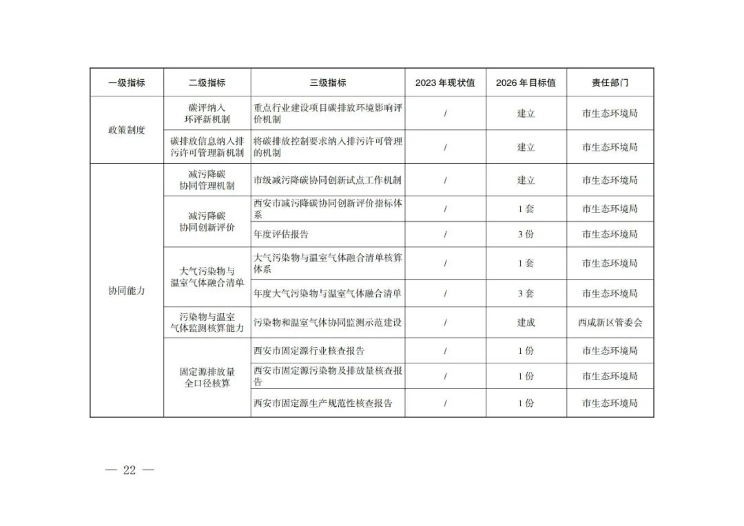 2026年,形成一套减污降碳协同创新管理机制、模式路径和政策举措,构建“4+3+3+6”减污降碳协同创新“西安模式”,即召开能源、交通、工业、环境治理4个领域的减污降碳协同创新,在园区、企业、项目3个层次培育和遴选减污降碳协同创新标杆,出台减污降碳协同增效金融政策、碳评纳入环评新机制、碳排放信息纳入排污许可管理新机制3项减污降碳协同创新政策,提升市级层面试点工作机制创新、减污降碳协同创新评价指标体系创建、大气污染物与温室气体融合清单编制、污染物与温室气体监测核算、固定污染源排放量全口径核算、协同管理创新6种减污降碳协同管理和创新能力。投资约262亿元,推进66个减污降碳协同创新重点项目建设,确保全市非化石能源占能源消费比重达到22%以上,单位GDP能耗、主要污染物总量减排和单位GDP二氧化碳排放降低率完成省上下达目标。碳排放强度下降与生态环境质量改善协同推进取得明显成效,减污降碳协同度达到同类型城市领先水平,绿色低碳循环开展的经济体系初步形成。